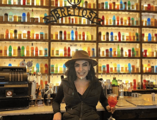 Operating since 1909, Brettos has had time to produce and collect lots of bottles. Two walls are lined with coloured glass bottles, a kaleidoscope of colour and alcohol…