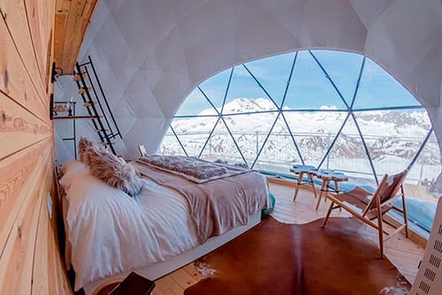 To get there you are transported via snowcat, a trip that lasts about 10 minutes and from there you have your own slice of ski resort heaven, with fabulous nordic styling your room features stunning views out to the piste over split levels and delicious dining for dinner and breakfast in the private restaurant dome.