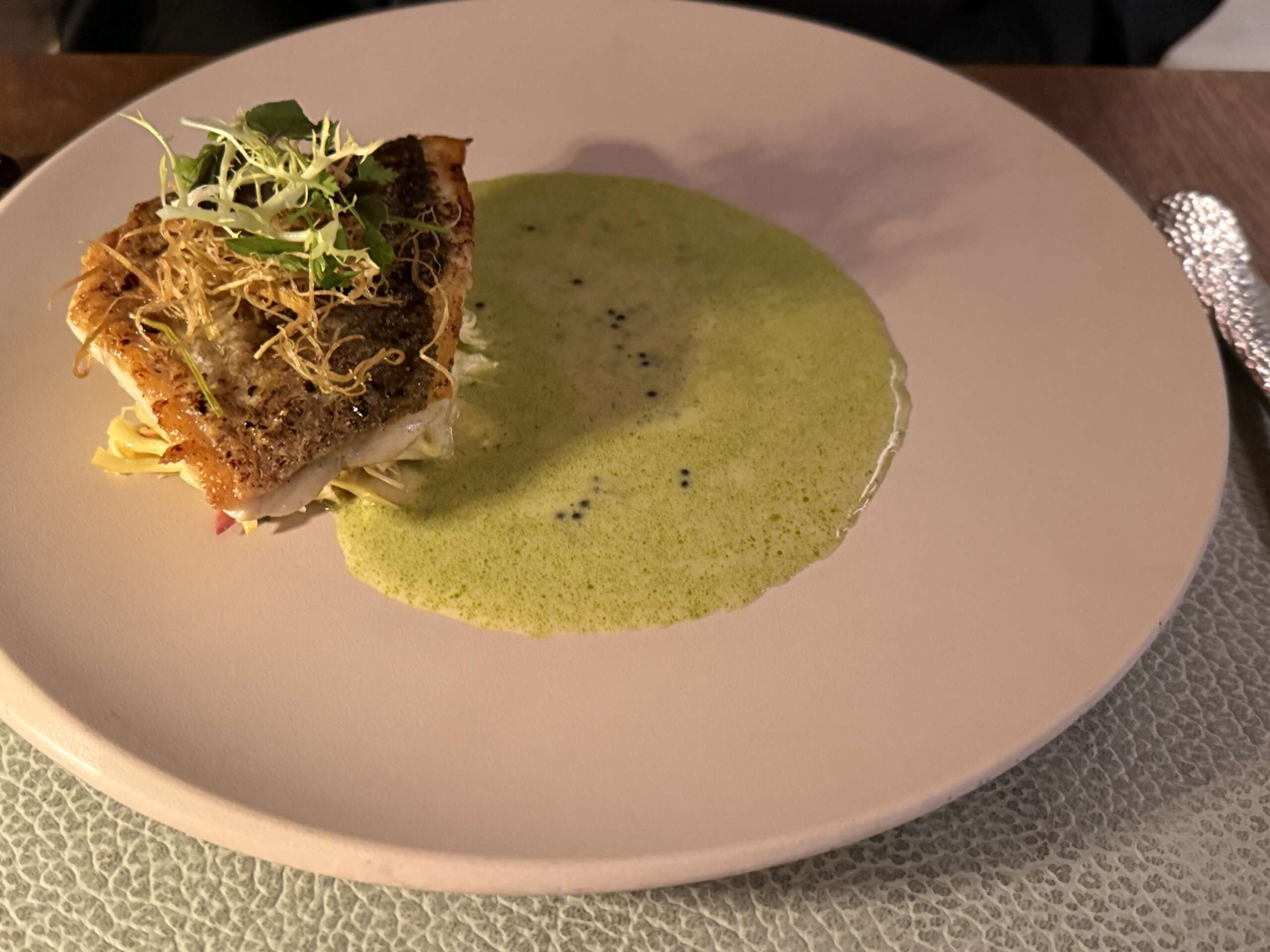 Our meal started with a shared steak tartare which was excellent (one of the best we have ever eaten) and had a mix of local mushrooms. Then for main course I had slow cooked veal beef cheek with polenta (which was oddly very firm but tasty) and Angie had Seabass with an amazing beurre blanc sauce. We shared a green salad and a crepê suzette for desert, which was the special but was a little disappointing.