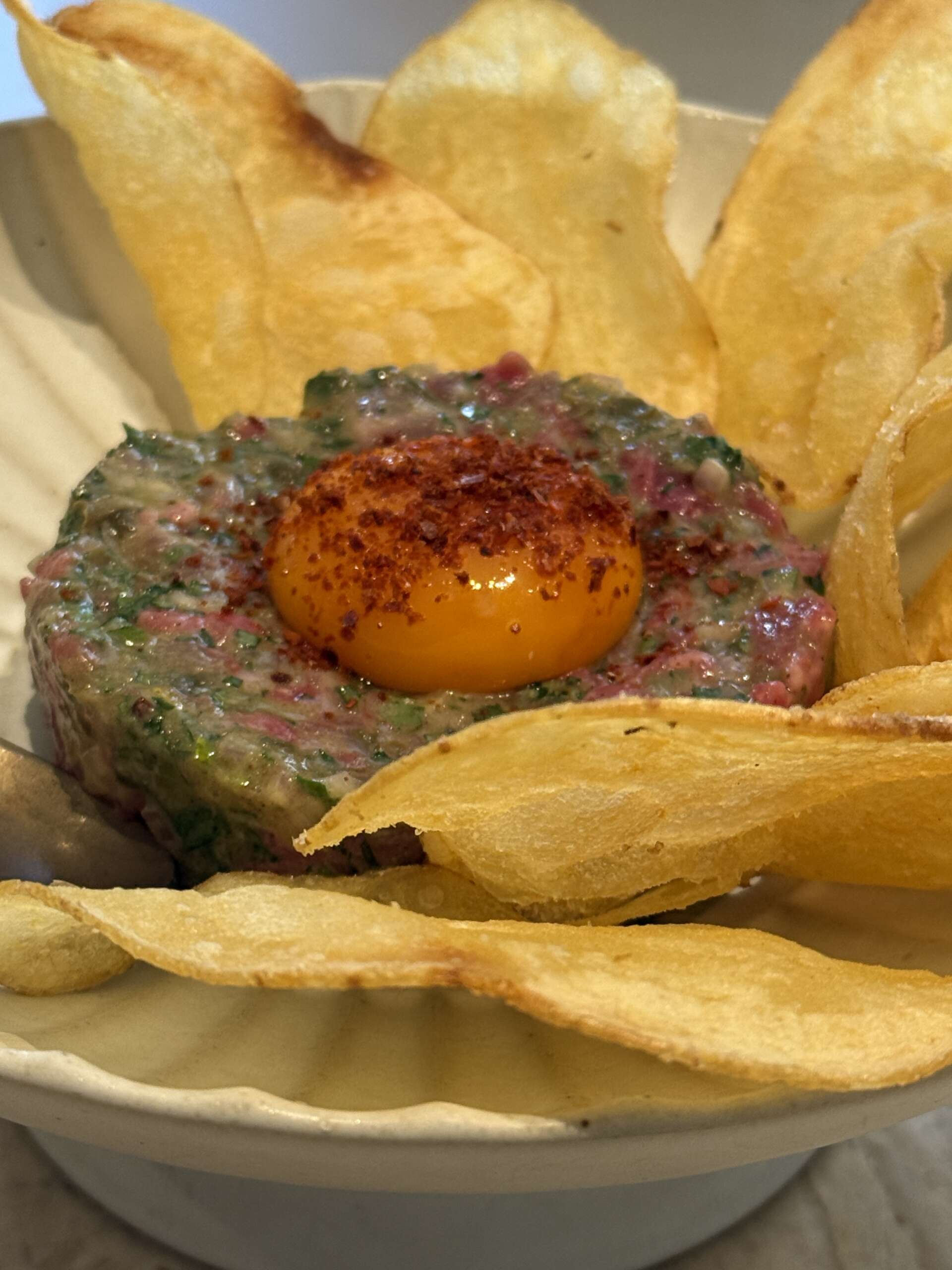 Our meal started with Kōst Fish Fingers which come from the snack’s part of the menu and are served with smoked salmon roe and tartare; deliciously crunchy with zest and salt. From there we went on to Steak Tartare served traditionally with egg yolk and very salty house made salt and vinegar crisps. The Fire Kissed Yellowfin Tuna with Pickled Walnut was a treat and the South Australian Calamari with whipped Judion beans and burnt chilli, together with a green salad was the perfect accompaniment.
