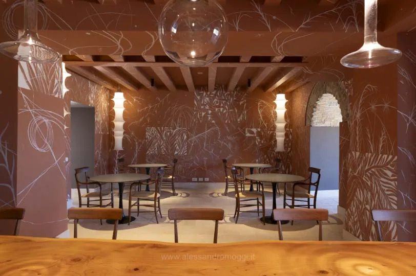 There are two places to eat Ginepro which starts with breakfast and views right across to the beach, it covers all time slots of daily catering. Rosso Tramonto is open evenings only and serves up gourmet dinners. Guests sit around a large chef’s table seating up to 10 people, constructed from a single wooden slab and overlooking an open kitchen. Bespoke murals by Sardinian artist Crisa, nom d’art of Federico Carta, adorn the red walls.
